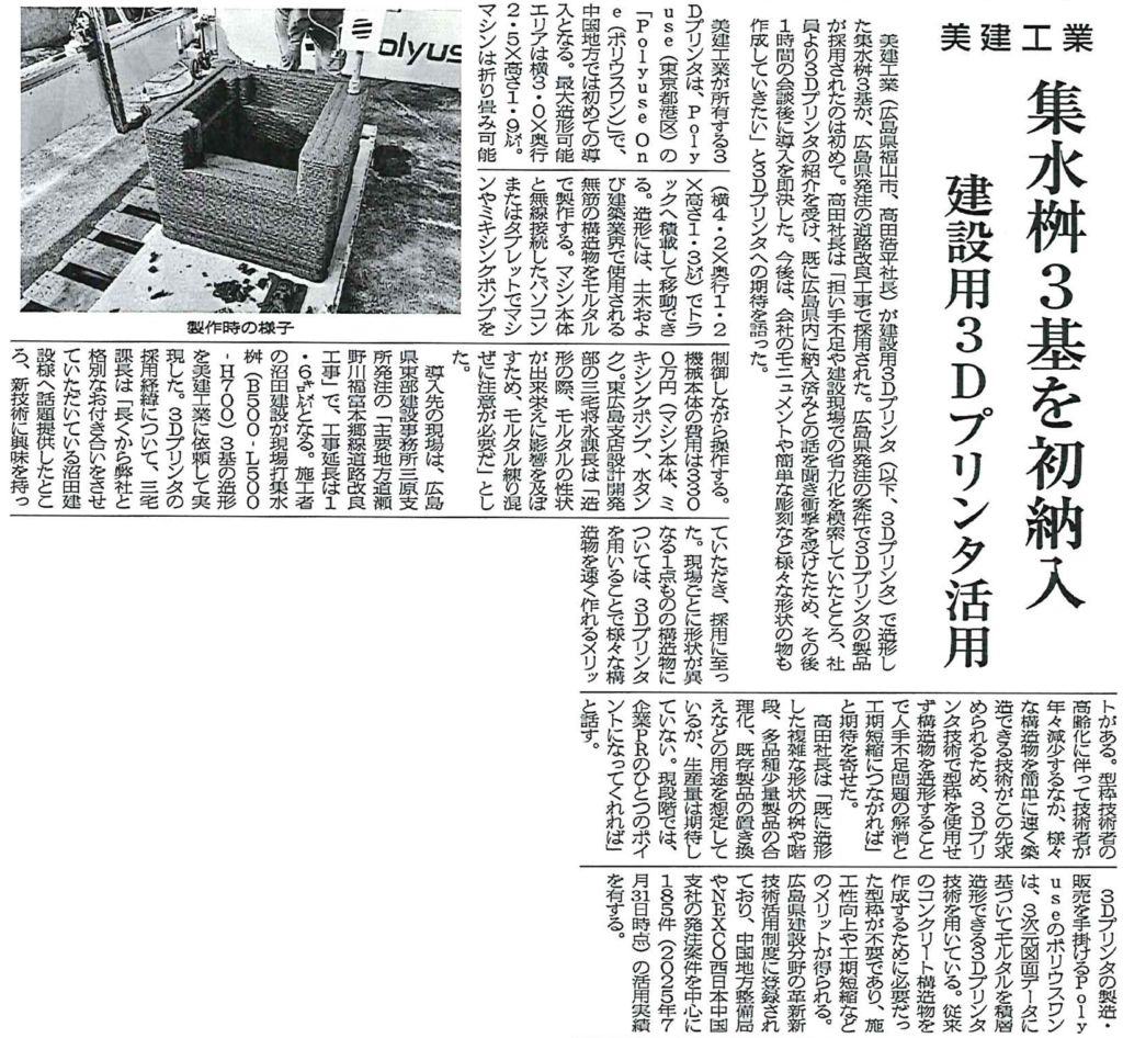 2026年1月19日発行のセメント関連業界専門紙「セメント新聞」に、弊社建設用3Dプリンタ造形記事が掲載されました。